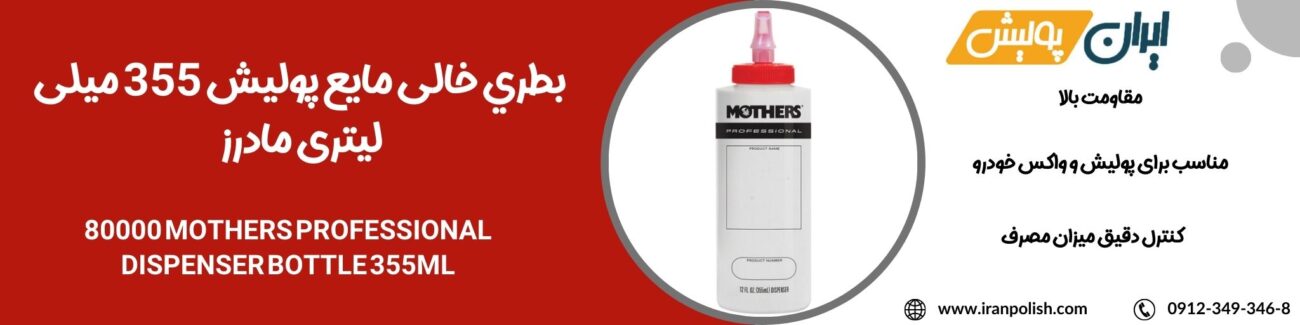 بطری خالی مایع پولیش 355 میلیلیتری مادرز مدل 80000 (Mothers Professional Dispenser Bottle 355ml) یک بطری مخصوص برای نگهداری و استفاده از مایعات مختلف نظافتی، پولیشها و واکسهای خودرو است. این بطری طراحی شده تا بهراحتی و با دقت مایعات را به سطح خودرو منتقل کرده و از هدر رفت مواد جلوگیری کند.